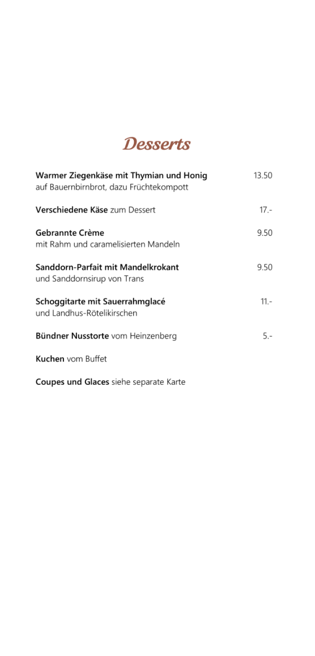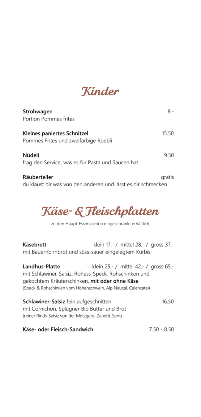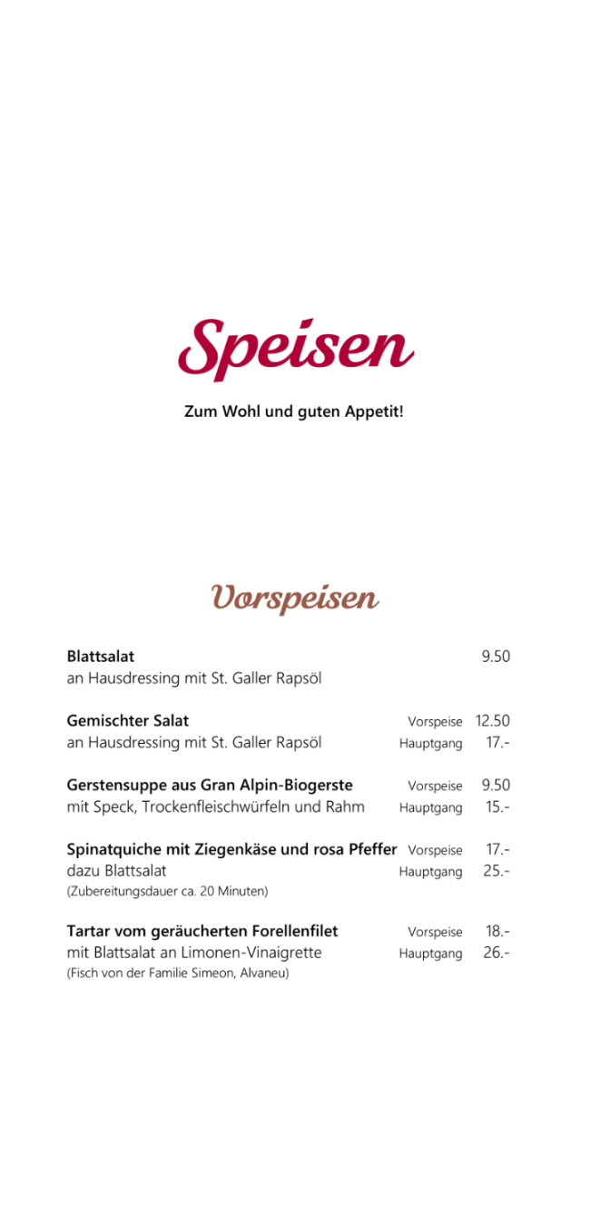 Unsere Tagesmenükarte ist das Herzstück unseres Angebots und wird täglich neu aufgeschaltet. Darauf finden wechselnde Gerichte aus all den tollen Produkten der Umgebung Platz, die sich mit der Verfügbarkeit und dem Lauf der Saisons verändern. Besonders beim Fleisch setzen wir auf ganze Tiere, die wir bei den Bauern direkt kaufen und im Schlachthof Mittelbünden metzgen lassen. So wissen wir ganz genau, was wir Ihnen auftischen und freuen uns an der aussergewöhnlichen Qualität dieses wertvollen Lebensmittels. Einige Klassiker sind allerdings so fein und beliebt, dass sie immer erhältlich sind: