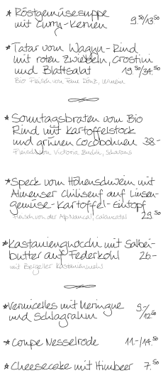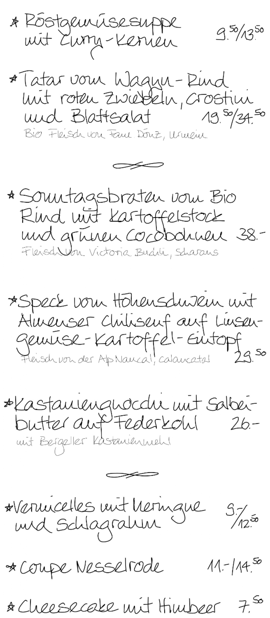 Wir kochen mit Sorgfalt und Liebe – und servieren mit Herz und Verstand. Unser wechselndes Tagesangebot besteht aus vegetarischen Gerichten und solche mit hochwertigem Fleisch, meist Bio. Einige Klassiker sind immer auf der Menükarte. Die Wein- und Käsekeller sind gut gefüllt mit Spezialitäten von nah und fern, die auf Schlemmer und Geniesserinnen warten!