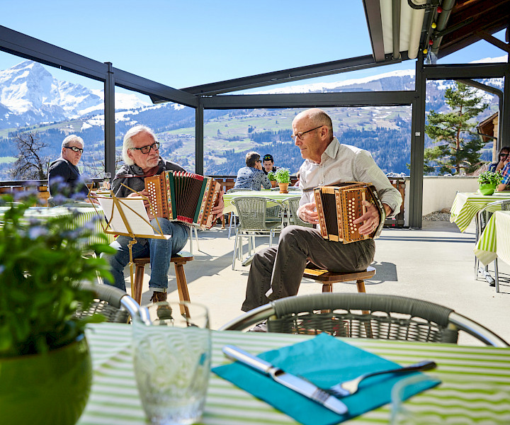 Das Herzstück des Landhus ist seit eh und je die Sonnenterrasse, von wo der Blick über Obstbäume auf die gegenüberliegende Häuserzeile und von dort weiter zum Beverin schweift, um schliesslich auf dem breiten Rücken des Heinzenbergs zu verweilen. Hier sind Sie schön geschützt vor dem Wind, der in Almens manchmal um die Ecken streift. Auch im Winter und besonders im Frühling geniesst man hier die wärmenden Sonnenstrahlen gern.